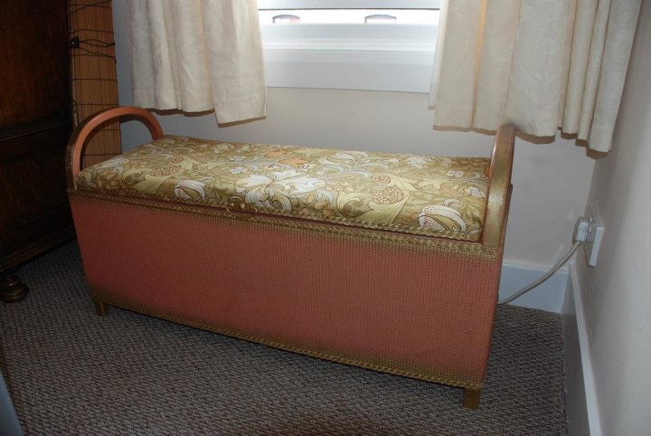 She used the linen fabric Golden Lily on fawn/gold background to cover a Loyd Loom ottoman she bought from a local carboot sale and later sent a photo.