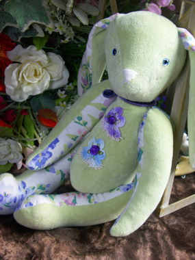 The jointed velvet teddy-rabbit below is called Albino and has ears and clothes made out of vintage Laura Ashley cotton fabric in a design called ‘stocks’.