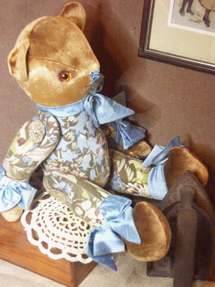 The mohair teddy bear below is dressed in vintage Sanderson cotton fabric for the clothes
