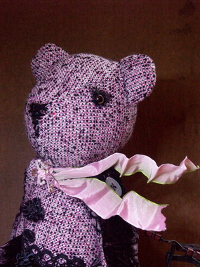This little teddy bear is called ‘tindy windy’ and is made from pink and black tweed and velvet and stands 14″ tall. Many of Lana’s bears are adult collectors items not for children.