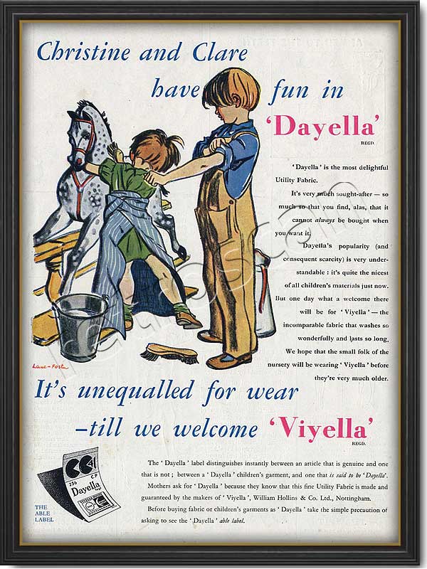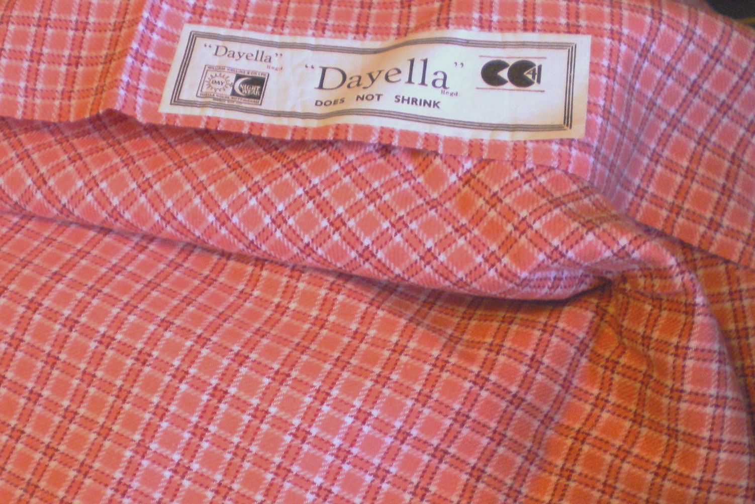 Dayella was produced by William Hollins of Nottingham the makers of Viyella. It was made especially for children’s wear and although I can’t find the exact constituents I would assume it has a larger precentage of cotton, more like 80% to 20% merino wool, making it harder wearing than Viyella.