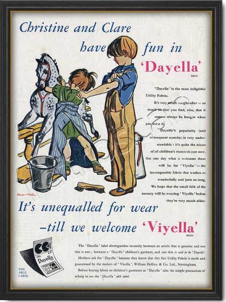 I recently acquired several pieces of Dayella with wartime utility marks which were printed on most fabric made during the second world war. These kite marks were often called cheeses or piecrusts because of their shapes the CC 41 stood for civilian clothing and were introduced in 1941. Clothing coupons were needed to buy utility clothing fabric and people would save up their coupons for months, which was how ‘make do and mend’ came into being; this was the start of recycling, with adult clothes being cut up to make children’s wear and old sweaters unpicked to re-use wool.