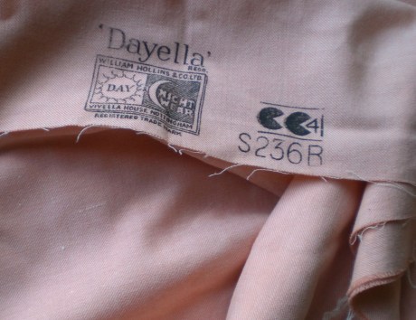 Soft pink Dayella fabric from the 1940’s with utility mark and William Hollis stamp from Viyella House Nottingham.