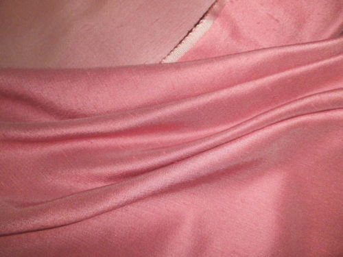 This vintage late 1930’s early 40’s pink dress making shot fabric has a darker pink slub cotton one side and satin-like silk dupioni on the right side (though each side could be used uppermost).