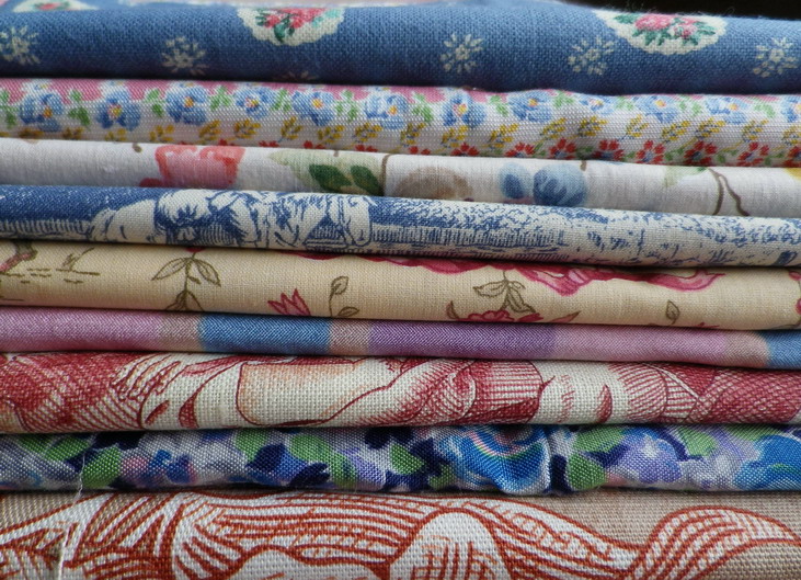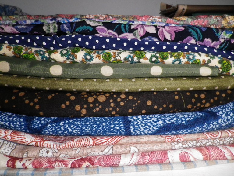 Bundles of fabric from my collection.This one include several spotted fabrics, the green in silk, the navy rayon and the bottom one cotton. 1940’s fabrics inc early Liberty silk and 50’s crepe.