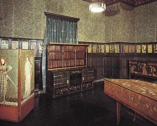 a room in the red house, with willow wallpaper above the panelling